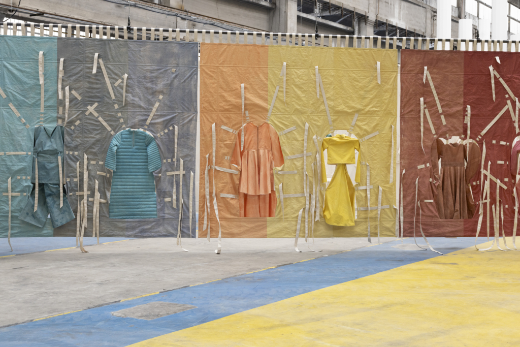 Acquise par le Frac-Artothèque en 2024, cette sculpture textile, composée de modules en toile comprenant chacun deux costumes bicolores, est représentative de la façon dont Nefeli Papadimouli combine l’architecture, la sculpture, le costume et la performance. Elle évoque l’histoire des luttes ouvrières et syndicales et s’inscrit dans les recherches de l’artiste examinant la manière dont les corps collectifs créent de nouvelles configurations spatiales et sociales. Cette œuvre monumentale a été produite par la 17ème Biennale de Lyon en 2024.